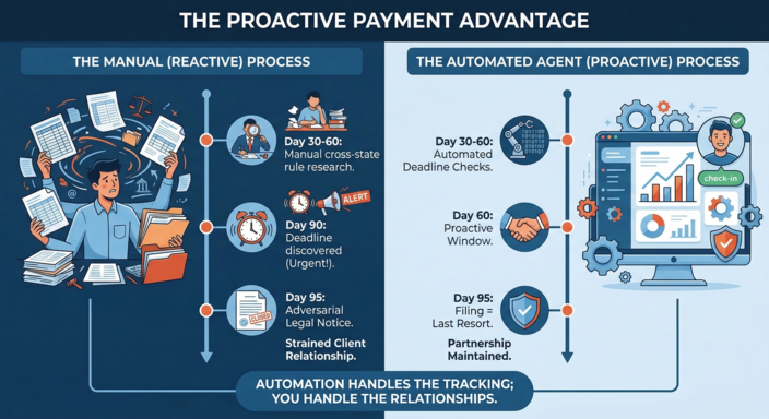 The time savings matter, but the real value is in the visibility. With automated monitoring, you can see payment issues at day 60 instead of day 95. That difference creates space for friendly resolution before formal processes become necessary.